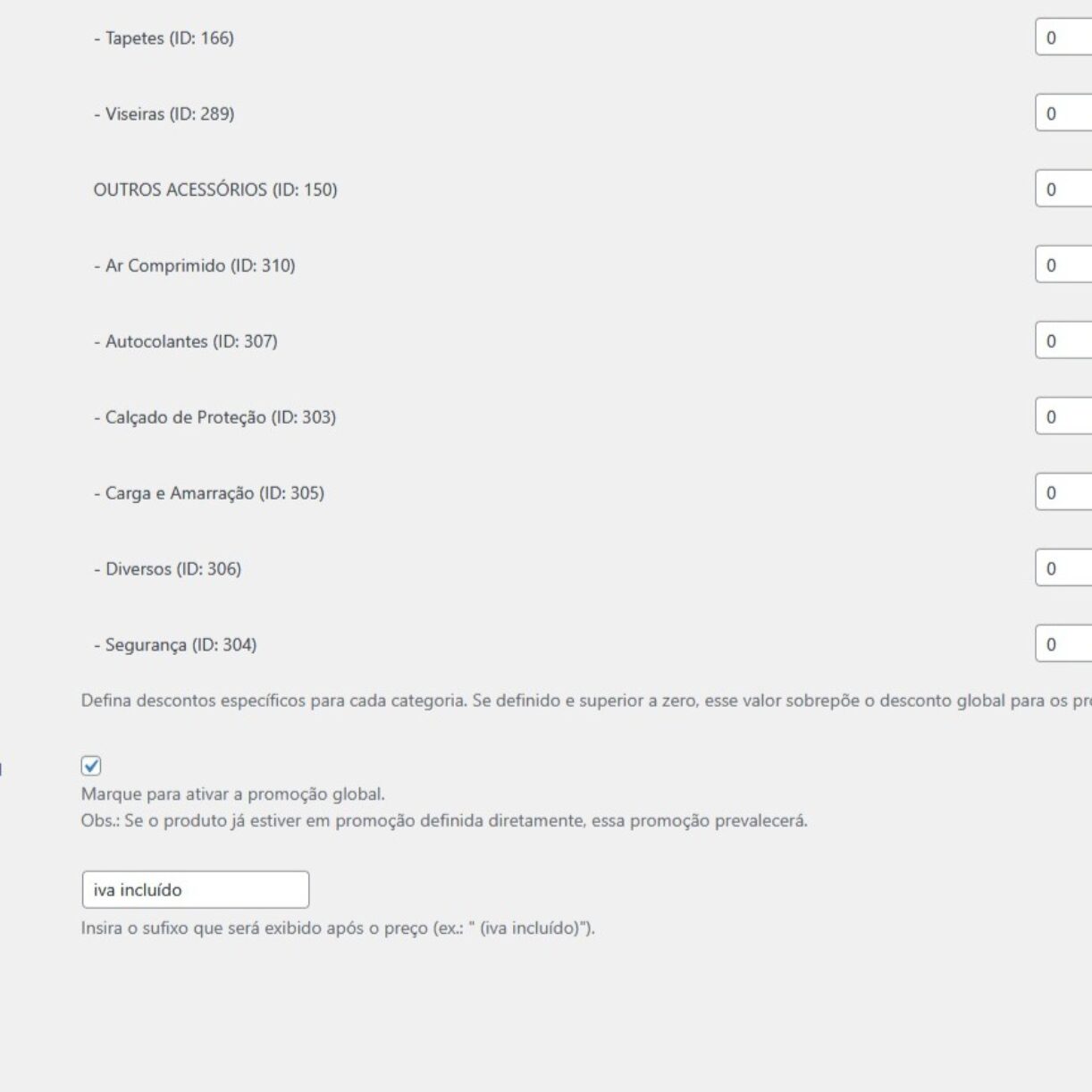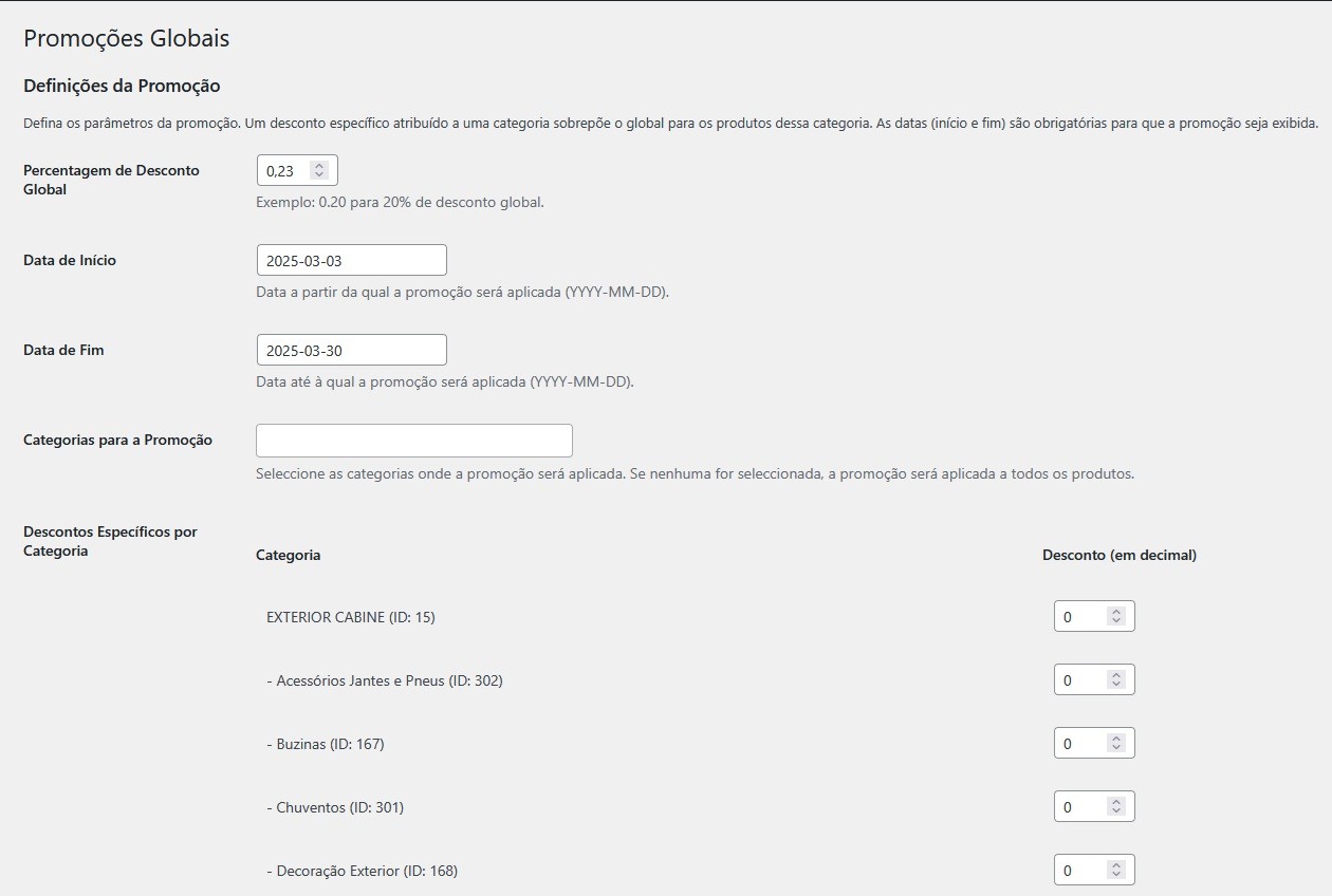 – **Interface Administrativa Amigável:** Configuração intuitiva através do painel de administração do WordPress, com campos para selecionar categorias (com hierarquia) e definir descontos específicos.