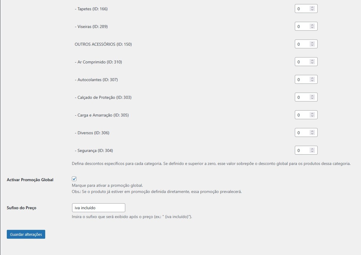 O plugin “Promoções Globais” permite aplicar um desconto (global ou específico por categoria) aos produtos da tua loja WooCommerce durante um período definido. Além disso, é possível configurar um sufixo personalizado que será exibido após o preço com desconto, oferecendo maior flexibilidade na apresentação dos valores.